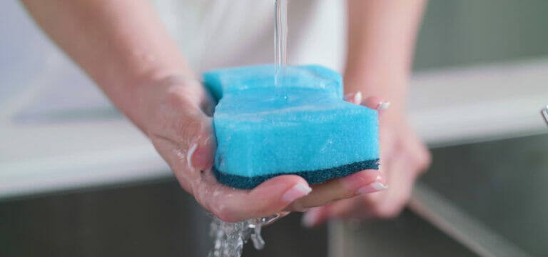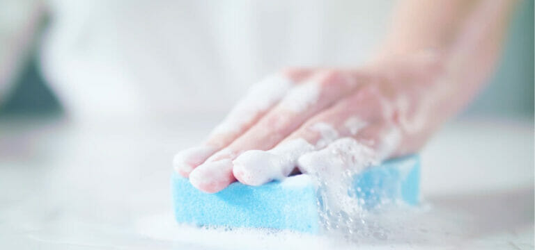 Apply 1-2 teaspoons of Caesarstone® Cream Cleanser directly to the foaming scrub, on the scrubber side. Gently squeeze to create a thick foam lather.