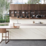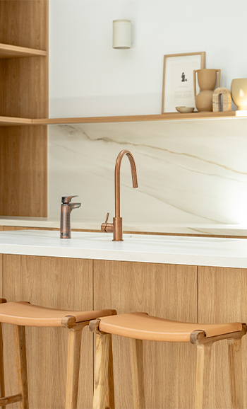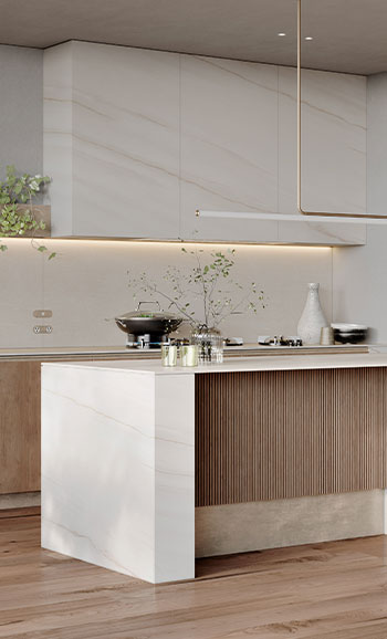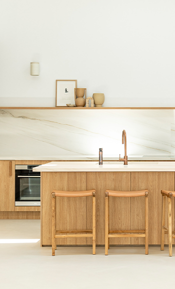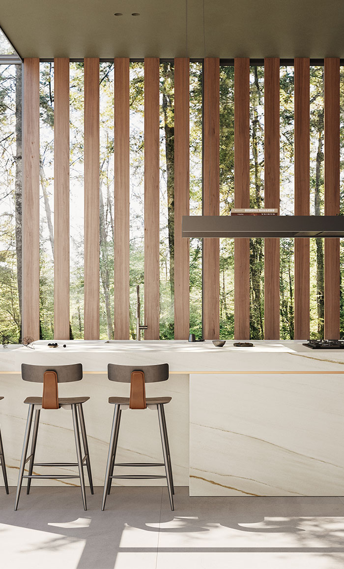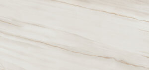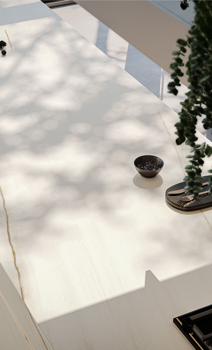 Emulating the natural beauty of Bianco Lasa marble, the creamy-white base features a pattern of directional striations in a mix of warm browns, graphite grey and golden honey, along with occasional highlights in white. Honed finish. All Porcelain colours are available for viewing in Caesarstone showrooms.