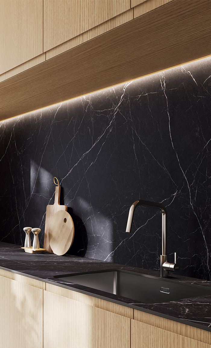 Bold, striking and a complete game-changer! With its midnight-black base and lightning-like streaks and striations in chalk-white, Smokestone is a powerful statement for any interior. Its irregular calcite streaks and layers of earthy impurities create a surface that exudes luxury and timeless elegance. Ultra Rough finish.