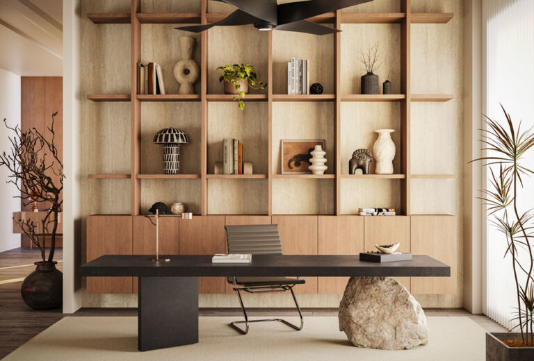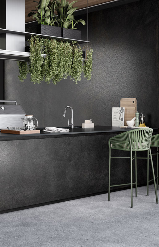 A moody palette of blue-grey and charcoal hues, with lighter and darker mottled areas. The corroded beauty of steel is layered with washed shades and granular effects, reinventing an industrial classic.