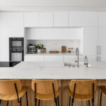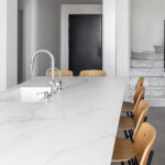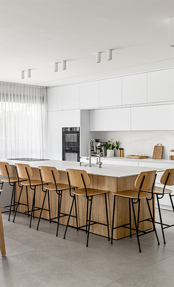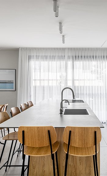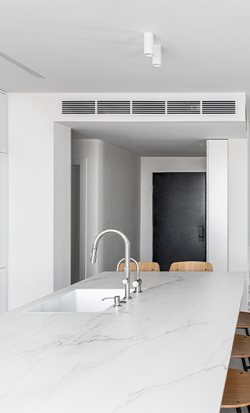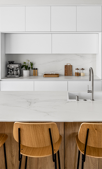 A marble-white background traversed by sporadic, delicate veining in golden browns and taupe grey. The translucent quality of this surface is enhanced by its Honed finish. All Porcelain colours are available for viewing in Caesarstone showrooms.
