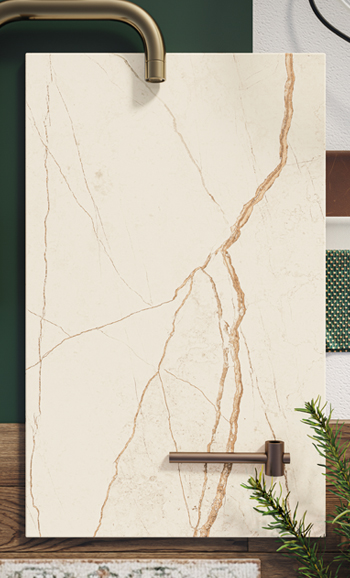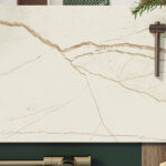 A spectacular embodiment of the marking of time on a neutral off-white base, bursting with a lively criss-crossing of oversized veins and fine crackled lines that feature ancient copper overlay, textured golden streaks, and primeval earthy sediments, in an outstanding composition unseen before, with a sleek and soft Silk finish.