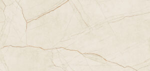 A spectacular embodiment of the marking of time on a neutral off-white base, bursting with a lively criss-crossing of oversized veins and fine crackled lines that feature ancient copper overlay, textured golden streaks, and primeval earthy sediments, in an outstanding composition unseen before, with a sleek and soft Silk finish.