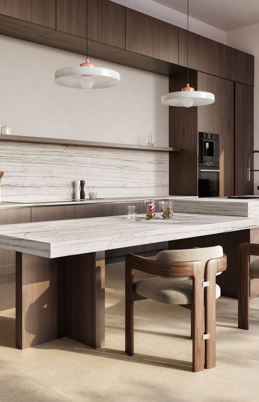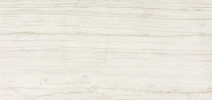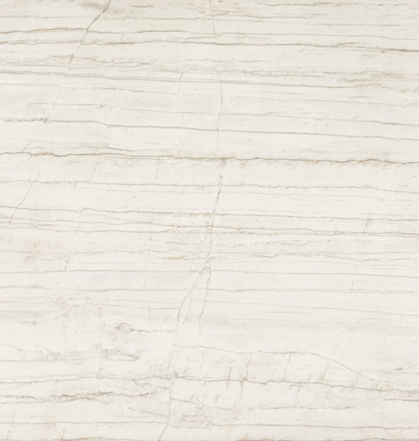 A bone-white base with recurring fine grey bands, intersected by thin fissures that evoke the prehistoric essence of crackled stone. This monochromatic design reflects light beautifully, creating an elegant and contemporary aesthetic.