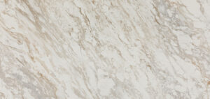A soft white base whipped up by fine light grey veining and copper accents that merge into the background, creating opaque layers with fluid quality and gentle rocky movement across the entire surface, enhanced by a luxurious silk finish.