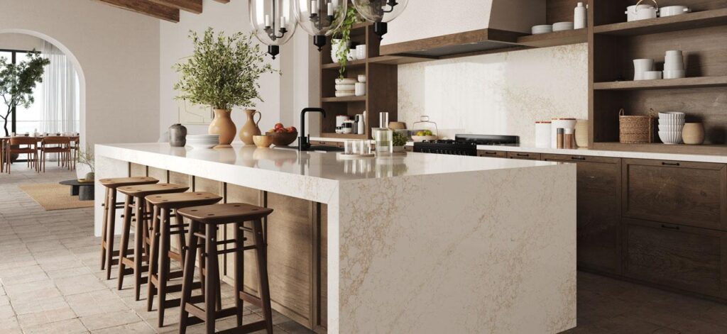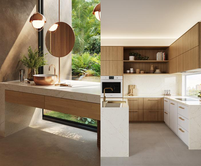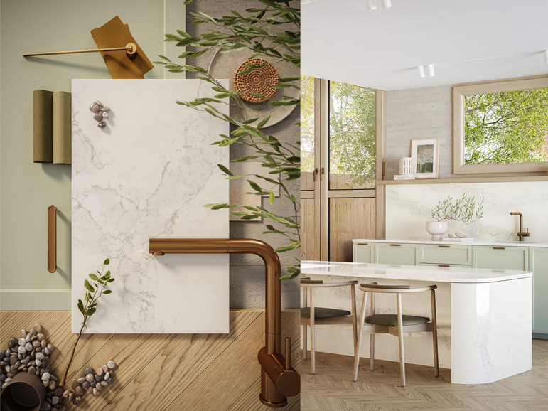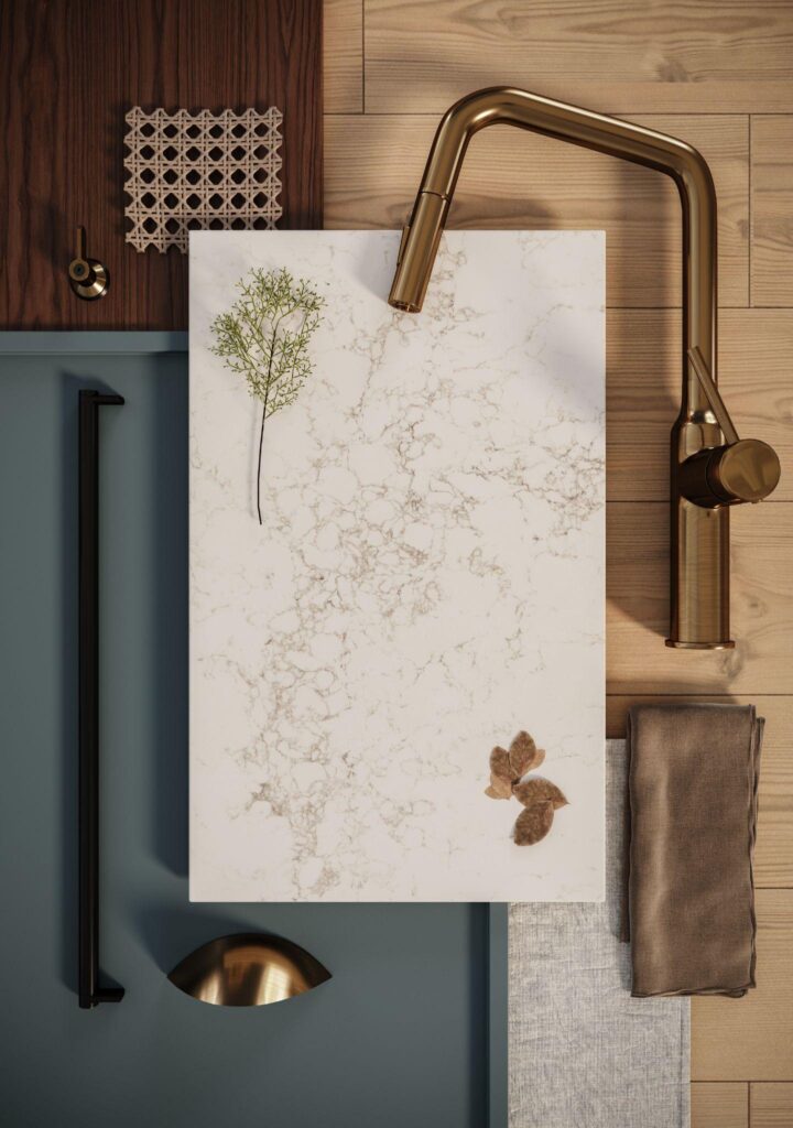 Goldfinch’s signature glow is achieved through Caesarstone’s proprietary mineral blend, which captures light differently from every angle—giving the surface its distinct golden shimmer under natural or ambient lighting.