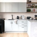 Maximising opportunities to add value, Kristy and Nat splurge on the captivating texture, and enriching grey and white tones of a Caesarstone® Airy Concrete™ bench top with waterfall edge and gorgeous Moda blush painted Perini glass tiles for their splashback.