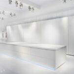 Caesarstone unveils a high-tech yet minimal and streamlined kitchen concept at Eurocucina 2012 featuring the Motivo Crocodile patterned texture surface.