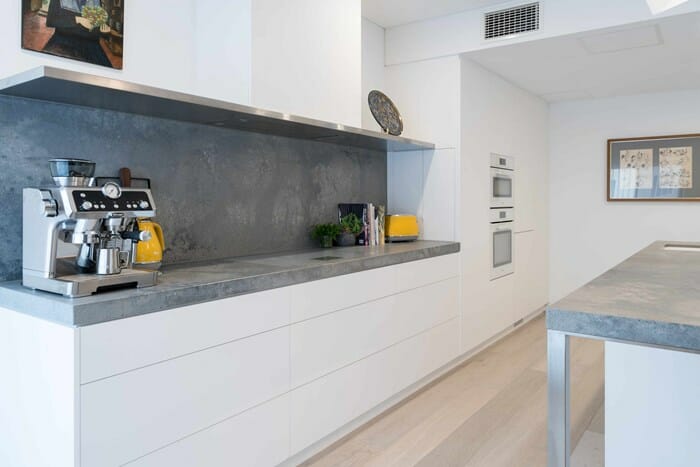 With its authentic look of hand-poured concrete, the benchtops blend superbly with the white colour palette softening its raw industrial aesthetic.